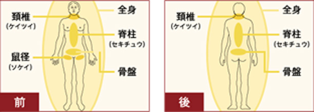 まず、うつ伏せになっていただき、頚椎(ケイツイ) ~脊柱(セキチュウ)~骨盤のゆがみ具合をチェックします。 |